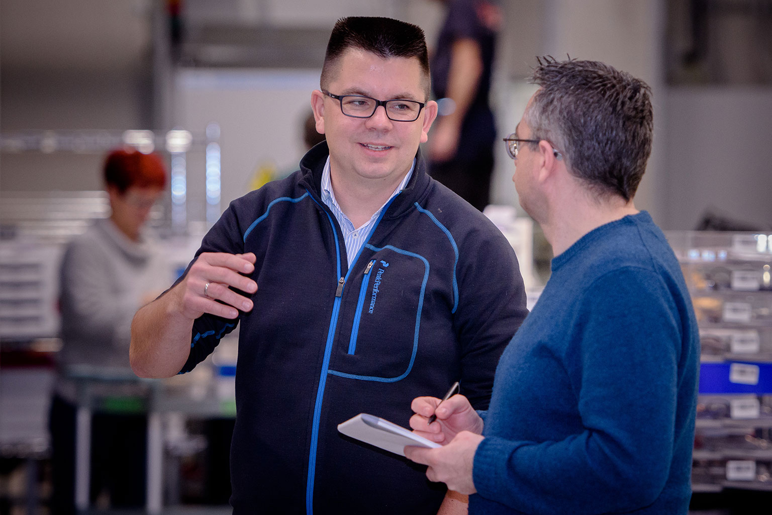 Warum sollte er sich auch nicht augenscheinlich authentisch geben? Abgesehen davon, dass er für weite Teile der Branche einem ungeliebten Konkurrenten ein Gesicht gibt, hat Graber eine Erfolgsgeschichte zu erzählen – eine, die nach eigenen Angaben rund 600 Partneroptiker in Deutschland, Österreich, der Schweiz und den Niederlanden mitschreiben. Das Logistikzentrum, das mit dem ersten Spatenstich im Februar 2016 innerhalb eines Dreivierteljahres hochgezogen wurde, ist nur ein Kapitel dieser Story – aber ein draußen sichtbares Statement. Der Service für die Onlinekunden habe immer im Mittelpunkt bei der Konzeption des Baus gestanden. Das bedeutet im Ergebnis nicht nur mehr Lagerfläche und Kapazität, sondern auch weitaus kürzere Bearbeitungszeiten. Die eigene Werkstatt mit 20 Augenoptikern ist in die Halle integriert, mittendrin auf der riesigen Fläche werden die Brillengläser in die Fassungen ein- geschliffen. Direkt daneben gibt es sehr ähnliche Arbeitsplätze für die Qualitätskontrolle. Fertigung und Kontrolle sitzen zusammen, aber getrennt voneinander, die Teams auf den beiden Seiten wechseln regelmäßig.