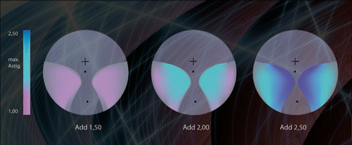 Bei einer Addition von 1,5 Dioptrien dürfen Sie mit rund 1,5 Dioptrien maximalen Astigmatismus rechnen, wobei dieser Wert natürlich abhängig ist vom Design und von der Progressionslänge. Es ist allerdings auch eine Tatsache, dass sich der maximale Astigmatismus um etwa denselben Betrag erhöhen wird, wenn Sie die Addition um 0,5 Dioptrien anheben. (Abb. 2).
