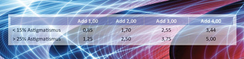 Über die Bestimmung der für den Träger richtigen Addition gibt es sehr verschiedene Ansichten. Gerade in den Anfangszeiten als Refraktionist dürften die meisten Fachleute so ihre Schwierigkeiten haben, zwischen Duan’scher Kurve, den Sehanforderungen des Kunden und der Erhaltung seiner Restakkommodation einen guten Mittelweg zu finden. Erst das Bewusstsein, in welchem Ausmaß sich der maximale Astigmatismus bei verschiedenen Additionen verhält, leitet oft ein Umdenken ein.