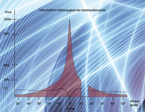 Ein ausgeprägtes zentrales Sehen ist die Grundvoraussetzung bei der Anpassung eines jeden Gleitsichtglases. Für eine gute Raumwahrnehmung ist vor allem die indirekte Sicht notwendig. Auch wenn die Sehschärfe in der Peripherie einen deutlichen Visusabfall erfährt (Abb. 1), ermöglicht sie uns die freie Bewegung und Orientierung. Auch reagieren wir in diesen Bereichen ganz sensibel auf Störfaktoren wie zum Beispiel die bekannten Abbildungsfehler in den Randbereichen der Gleitsichtgläser. Beim Blick auf Abbildung 1 könnte leicht der Eindruck entstehen, dass die vorhandenen Abbildungsfehler eines Gleitsichtglases eine weit geringere Rolle spielen, wenn man in den peripheren Netzhautbereichen gerade mal einen Visus von 0,25 oder weniger erreicht. Doch es ist oft festzustellen, dass sich ein Refraktionsfehler gravierend auf die Raumwahrnehmung auswirkt – selbst wenn er nur eine Viertel Dioptrie beträgt.