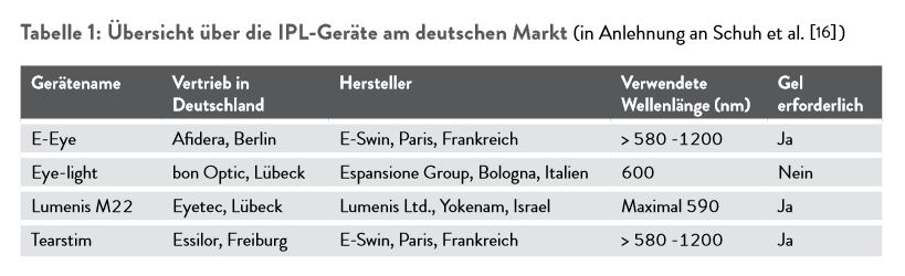 Seit der Entdeckung der Vorteile von IPL für MGD-Patienten, gibt es eine Zunahme der Nachfrage und ein steigendes Angebot an Instrumenten für diesen Behandlungsansatz. Die derzeit in Deutschland auf dem Markt vorhandenen Instrumente sind in Tabelle 1 gelistet.
