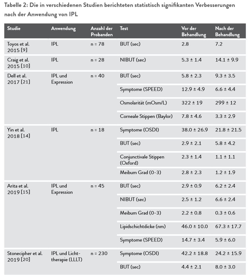 Gupta et al. beschreiben IPL als sicheres und effektives Verfahren zum Management des evaporativ trockenen Auges. [12] Eine retrospektive Überprüfung der Daten von 78 Patienten ergab, dass 90 Prozent unmittelbar nach der Behandlung eine verbesserte Tränenfilmaufreißzeit (BUT von 2,8 sec vor auf 7,2 sec nach der Behandlung), ein verbessertes subjektives Erscheinungsbild des Lidrandes, eine bessere subjektive Qualität des Sekretes der Meibomschen Drüsen sowie eine erhöhte Patientenzufriedenheit aufwiesen. [9] Spätere prospektive Studien scheinen diese frühen Befunde zu bestätigen und zeigen eine Verbesserung der Symptome des Trockenen Auges und/oder der Funktion der Meibomschen Drüsen mit IPL allein oder IPL in Verbindung mit einer Expression der Meibomschen Drüsen oder einer Lichttherapie (Tabelle 2). [5, 10, 14, 15, 20-23] Arita et al. zeigten, dass die Kombination aus IPL und Expression der Meibomschen Drüsen im Vergleich zu einer alleinigen Expression der Meibomschen Drüsen zu einer signifikanten Verbesserungen in Bezug auf Lipidschichtdicke, nicht invasive Aufreißzeit (NIBUT), Aufreißzeit BUT, Lidrandanomalien, Meibomsekret sowie Symptomfragebogen, führte. [15] Probanden mit höherer Tränenfilminstabilität zu Studienbeginn reagieren scheinbar besser auf das Verfahren und sind wahrscheinlich die idealen Kandidaten für die IPL Anwendung. [24]