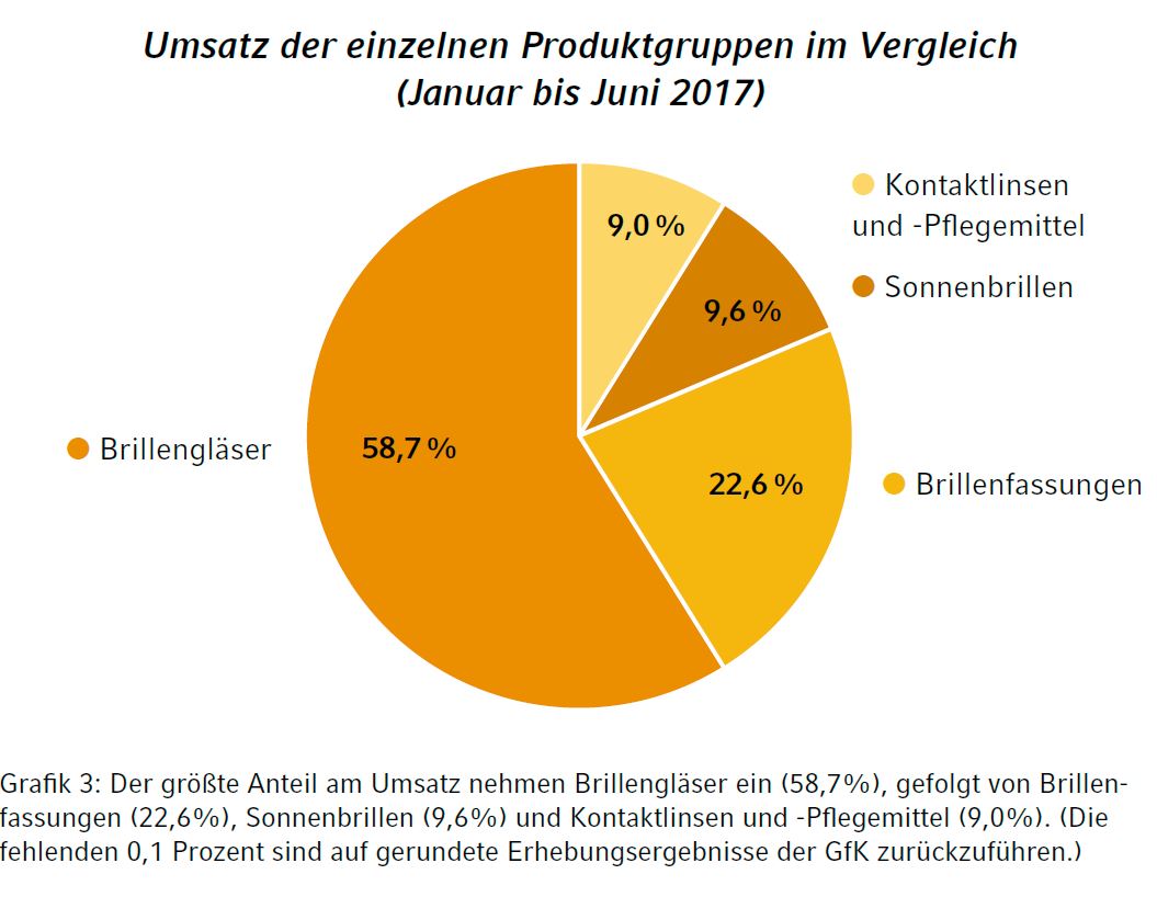 Der Brillengläsermarkt war auch 2017 das mit Abstand größte Segment der Augenoptik und erwirtschaftete 58,7 Prozent des Marktwerts der EU4-Zone. Er sank leicht um minus 1,1 Prozent. Der Rückgang bei den Brillengläsern wurde teilweise durch den leichten Anstieg der Brillenfassungen (+1,2) ausgeglichen, der 22,6 Prozent des Umsatzes ausmachte. Sonnenbrillen repräsentierten einen Wert von 9,6 Prozent des Marktwerts und waren damit leicht rückläufig (-1,1). Schließlich nahm das Segment Kontaktlinsen und Pflegemittel neun Prozent des Marktes ein und stieg um 1,4 Prozent an.