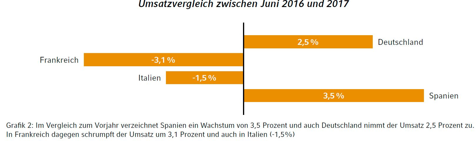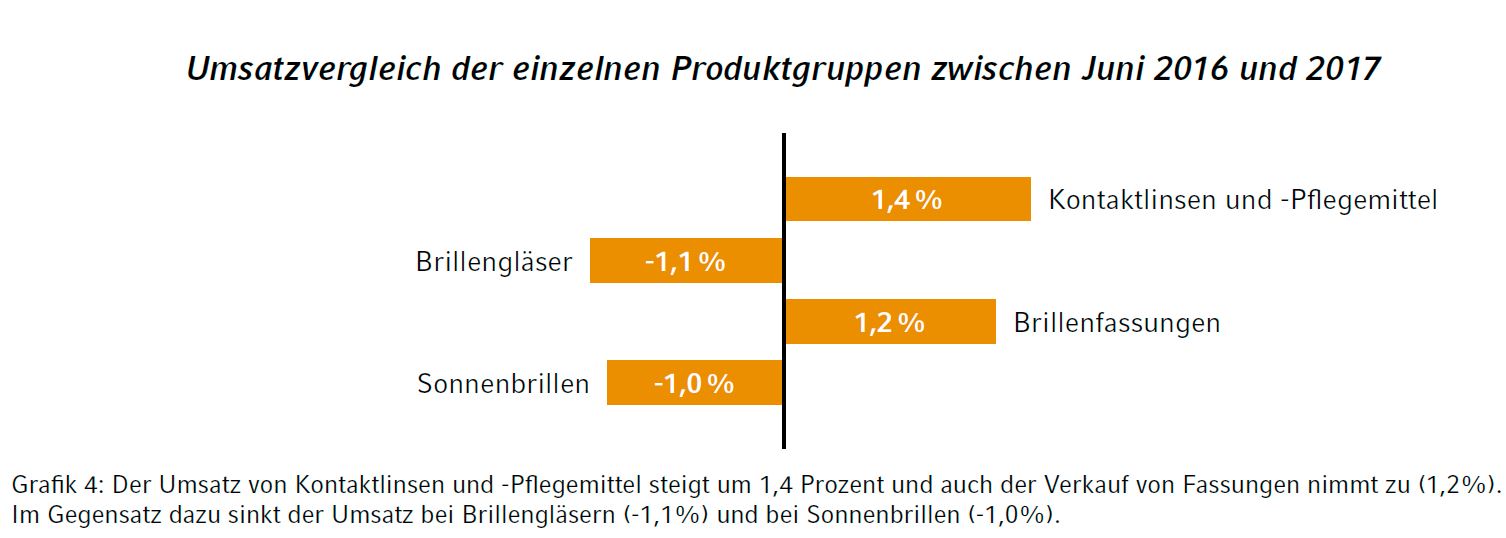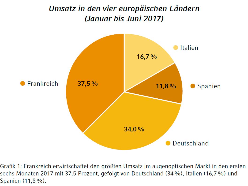 In Deutschland entwickelte sich das Wachstum vor allem angetrieben durch den Verkauf von Brillenfassungen als auch von Gläsern (+3,6 bzw. +2,7) positiv, der Verkauf von Kontaktlinsen und Pflegemittel blieb nahezu stabil. Im Gegensatz dazu nahm der Sonnenbrillenverkauf ab. In Spanien hingegen stieg der Umsatz im Kontaktlinsenmarkt, der zusammen mit den Pflegemitteln ein Wachstum von 6,9 Prozent verzeichnete. In Italien folgte ein negativer Trend beim Sonnenbrillenabsatz (-3,1) sowie bei den Brillengläsern (-3,5). Die positive Umsatzentwicklung der Brillenfassungen (+3,2) glättete den insgesamt negativen Trend des Landes.