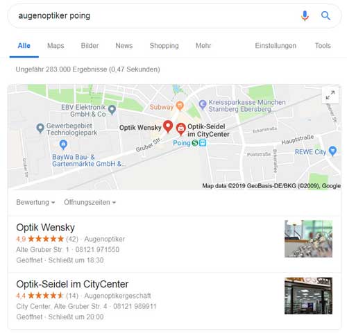 Jeden Tag suchen Millionen Menschen im Internet nach Dienstleistungen und Produkten vor Ort. Google versucht, die Suchanfragen optimal zu befriedigen und passende Suchergebnisse anzuzeigen. Die Suchergebnisse unterscheiden sich zu anderen Suchanfragen darin, dass zuerst eine Google-Maps-Karte und dann in der Folge drei Augenoptiker angezeigt werden. Erst nach diesem „Local Pack“ folgen weitere Suchergebnisse und die Websites lokaler Unternehmen werden angezeigt (Abb. 1).