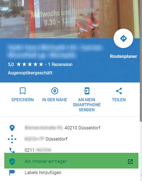 Nahezu jeder Augenoptiker hat dort einen Unternehmenseintrag. Entweder hat Google diese Daten aus öffentlichen Verzeichnissen integriert oder Kunden haben das Geschäft auf der Karte eingetragen. Der erste Schritt besteht darin, dass der Augenoptiker sich auf Google Maps selber findet, ein Google-Nutzerkonto eröffnet und sich als Unternehmer einträgt (Abb. 2). Er bekommt in der Folge eine Postkarte mit einem Code an seine Geschäftsadresse zugesandt. Dieser Code berechtigt den Augenoptiker, seinen Unternehmenseintrag zu bearbeiten. Jetzt geht es darum, diesen optimal auszufüllen.
