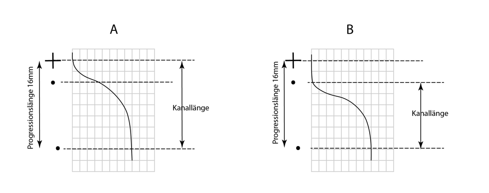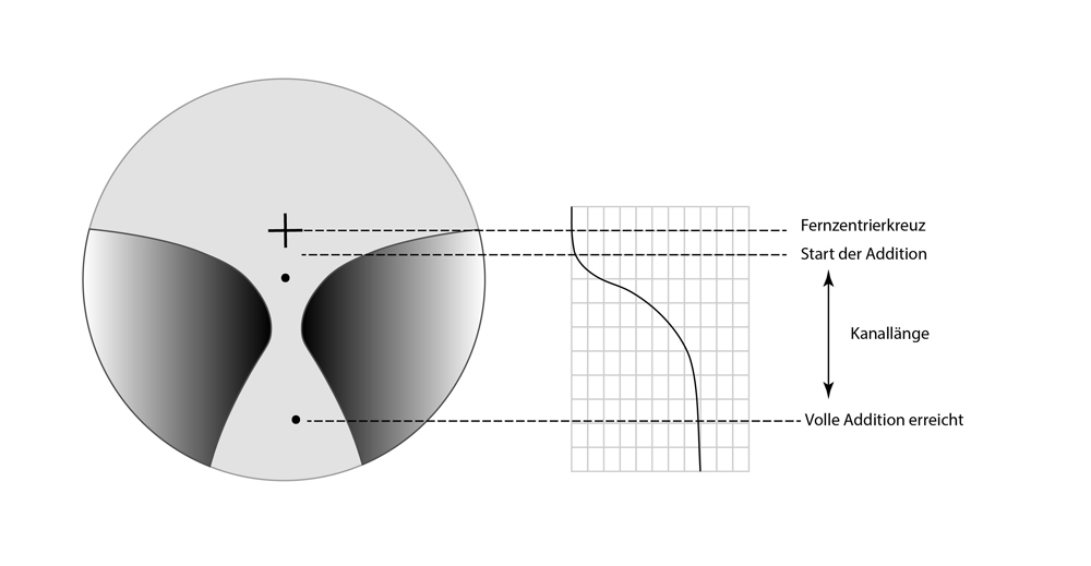 Aus technischer Sicht definiert die Progressionslänge den ersten Additionsanstieg bis zu jenem Punkt, an dem die gewünschte Addition erstmalig erreicht wird (Abb. 1). Manche Hersteller bezeichnen diese Strecke auch als Kanallänge. In der Praxis – und der Einfachheit halber – gehen aber viele Hersteller von einem fixen Bezugspunkt aus, wie zum Beispiel dem Fernzentrierkreuz oder dem Prismenbezugspunkt. Diese Längendefinition gibt aber keinen Aufschluss über die tatsächliche technische Progressionslänge.