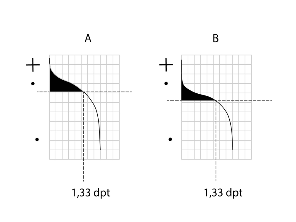 Das Glas B hat eine kürzere technische Progressionslänge als Glas A. Aus dieser Tatsache heraus wird beim Glas B der maximale Astigmatismus höher liegen und der Sehkanal enger sein. Je nach physiologischer Wahrnehmung des Trägers wird er diesen höheren Astigmatismus als vermehrten Schaukeleffekt bemängeln, oder aber über einen engeren Zwischenbereich klagen.