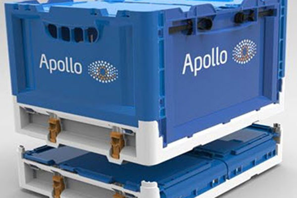 Dabei werden leere Behälter zusammengeklappt und an den Boden eines vollen Behälters geklippt. Durch diesen Klickmechanismus können bis zu zwei leere Behälter mit einem vollen Retourenbehälter verbunden werden. Die Plomben der Verpackungen und die ausgedienten Boxen lassen sich zudem vollständig recyceln. Entwickelt wurde der Versandbehälter von Apollo und Schoeller Allibert.