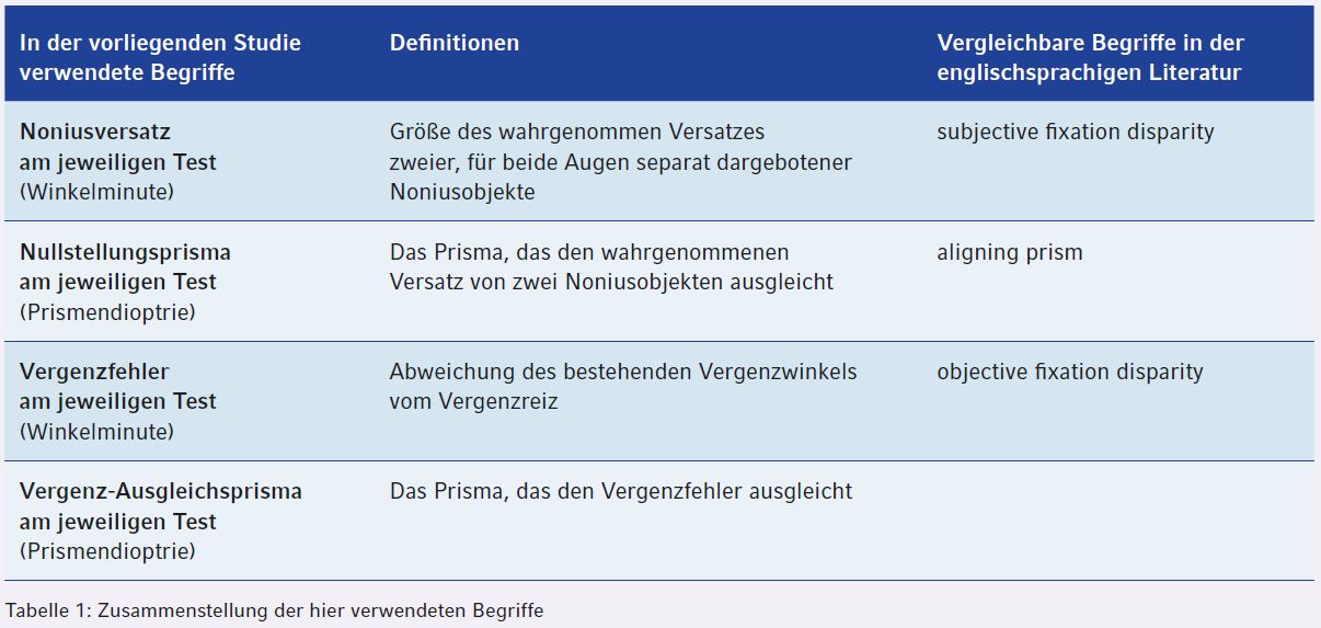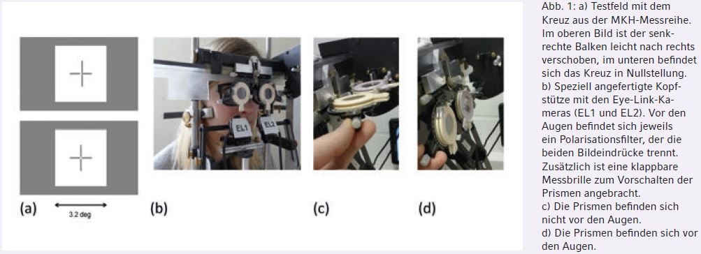 Die Messung der Augenbewegungen bei MKH-Kreuztestprismen war daher das Thema dieser Bachelorarbeit [7] am Leibniz-Institut für Arbeitsforschung an der TU Dortmund in Kooperation mit der Beuth Hochschule für Technik in Berlin. Zur klaren Definition der zu Grunde liegenden physiologischen Mechanismen wurde in der vergangenen Ausgabe eine neue Begrifflichkeit entwickelt [8]. Aus diesem Grund ist es für das Verständnis dieses Artikels notwendig, zunächst Teil 1 dieses Artikels aus der vergangenen Ausgabe zu lesen. Darüber hinaus sind alle neuen Begriffe in der Tabelle 1 zusammengefasst.