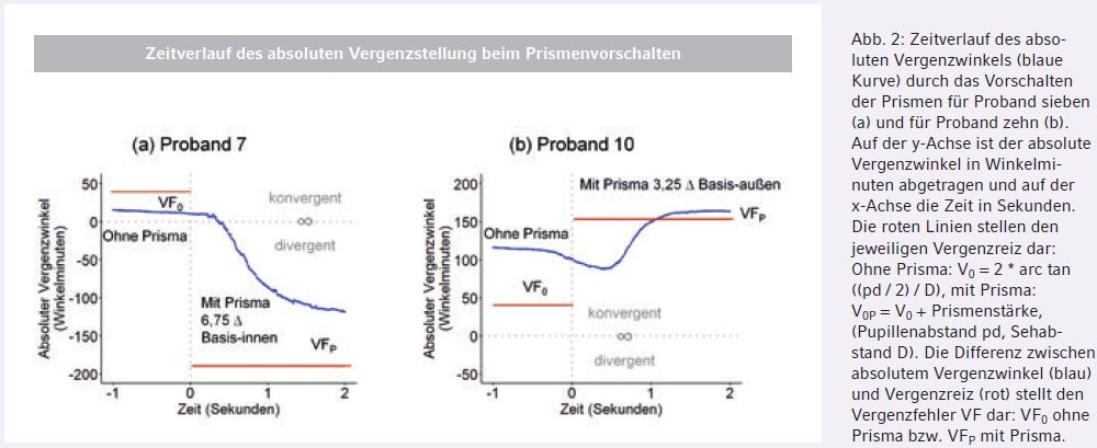 Abb. 2 zeigt in zwei Einzelfällen den zeitlichen Ablauf der Vergenzmessungen als Mittelwert über alle Messwiederholungen. Es ist der absolute Vergenzwinkel in Winkelminuten dargestellt; ein absoluter Vergenzwinkel von Null entspricht parallelen Sehachsen, also unendlich (∞). Proband sieben hat ohne Prisma einen Exo-Vergenzfehler VF0 = – 27 Winkelminuten relativ zum Vergenzreiz mit dem absoluten Vergenzwinkel von V0 = 40 Winkelminuten; dieser Wert ergibt sich aus der Pupillendistanz von pd = 58 mm und dem Sehabstand von D = 5 m entsprechend V0 = 2 arc tan ((pd/2)/D). Durch das Vorschalten des Basis-Innen Kreuztestprismas von P = - 6,75 Prismendioptrien = - 231 Winkelminuten verschiebt sich der Vergenzreiz in divergenter Richtung auf V0P = V0 + P = 40 – 231 = - 191 Winkelminuten, was also einer Divergenzstellung entspricht. Durch diesen Vergenzreiz vollziehen die Augen einen divergenten Vergenzsprung. Es verbleibt mit Prisma ein Eso-Vergenzfehler von VFP = + 67 Winkelminuten relativ zum Vergenzreiz von – 191 Winkelminuten.