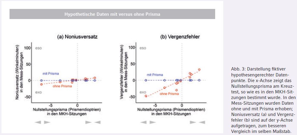 Zunächst geht es in Fragestellung 1 darum, wie die Messergebnisse ohne Prisma vom Nullstellungsprisma am Kreuztest abhängen (rote Datenpunkte). Dazu ist zu prüfen, ob bei einem Teilnehmer mit einem Nullstellungsprisma Basis außen auch ein Noniusversatz und ein Vergenzfehler in Eso-Richtung vorliegt, bzw., ob bei einem Nullstellungsprisma Basis innen die Messwerte in Exo-Richtung liegen. Ließe sich also Frage 1 mit einem klaren „Ja“ beantworten, lägen alle Datenpunkte in Abb. 3 im richtigen Quadranten. Die Messwerte sollten mit der Stärke des Prismas ansteigen. Auch diese rein hypothetischen Daten sind nicht auf einer perfekten Geraden eingezeichnet, da bekannt ist, dass zu einem bestimmten Prismenwert nicht bei allen Personen derselbe Noniusversatz bzw. Vergenzfehler zu erwarten ist. Außerdem ist berücksichtigt, dass der Vergenzfehler bekanntermaßen meist etwa fünf bis zehn Mal so groß ist wie der Noniusversatz.