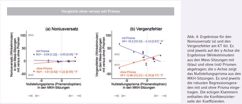 Wenn kein Prisma angewendet wurde, bestätigte sich die Erwartung, dass das Kreuztestprisma eine Vorhersage des Noniusversatzes und des Vergenzfehlers erlaubt; dies zeigen die signifikant positiven Steigungen in Abbildung 4 (ohne Prismen). Es bestehen jedoch die erwarteten Größenunterschiede zwischen diesen beiden Messwerten.