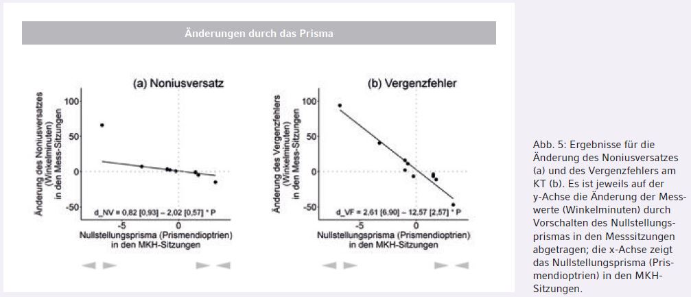 Die Größe des MKH-Kreuztestprismas erlaubt eine gute Vorhersage der prismen-induzierten Änderungen, sowohl für den Noniusversatz (Abb. 5a) als auch für den Vergenzfehler (Abb. 5b). Es sei jedoch auf die unterschiedlichen Größenordnungen hingewiesen. Der Noniusversatz ändert sich nur um 16 Prozent des Vergenzfehlers (2,02 Winkelminuten / 12,57 Winkelminuten = 0,16).