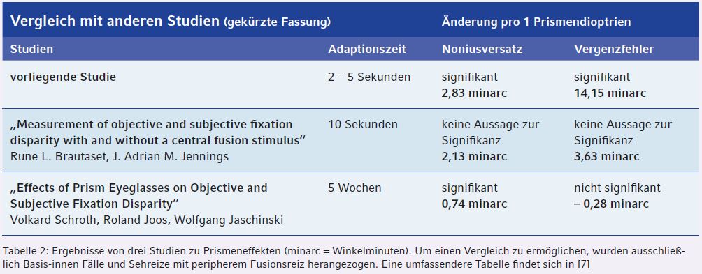 Einige Aspekte blieben jedoch auch offen. Längere Prismenanwendungen über einige Minuten oder das dauerhafte Tragen einer Korrektionsbrille könnten zu quantitativ anderen Befunden führen (Tab. 1). Mit einem zentralen Fusionsreiz sind möglicherweise auch modifizierte Ergebnisse zu erwarten. Eine Unterscheidung zwischen Basis-innen und Basis-außen Prismen [11] konnte hier wegen der zu kleinen Probandenzahl nicht durchgeführt werden.