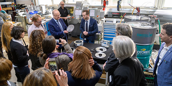 Anschließend geht es in die „heiligen Hallen“ des Unternehmens. Die Journalisten-Gruppe folgt Rainer und Matthias Kirchhübel in die unteren Geschosse. Dort werden die optometrischen und ophthalmologischen Geräte zu einem großen Teil gefertigt. An den unterschiedlichen Stationen der Fertigung herrscht reges Treiben, Mitarbeiter begutachten die Komponenten, bugsieren sie zum nächsten Fertigungsschritt, überwachen die übermannsgroßen Maschinen. Diese wiederum fahren ihre Arme aus, zischen, sprühen Wasser, rattern und brummen, um am Ende ein fertiges Element zu präsentieren. Einzelne Maschinen würden 24 Stunden und sieben Tage in der Woche laufen, berichtet der Firmenchef. Daher sei eine konstante Stromversorgung essenziell für die Produktion der anspruchsvollen Geräte.