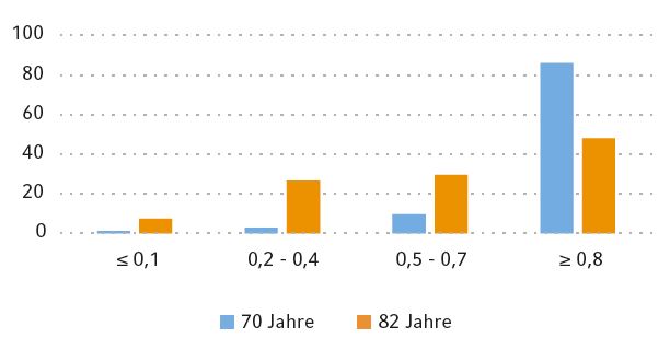 Die Sehschärfe bleibt von der Jugend bis ins Alter über viele Jahrzehnte konstant auf einem hohen Niveau. Eine schwedische Untersuchung kam zu dem Ergebnis, dass 86 Prozent aller 70-Jährigen und nahezu jeder zweite 82-Jährige noch über einen Visus von mindestens 0,8 verfügten. [6] Zwei Drittel aller 82-Jährigen hatten eine Sehschärfe von mindestens 0,5 und wären damit noch berechtigt, ein Kraftfahrzeug zu führen. Nur drei Prozent aller 70-Jährigen hatten eine Sehschärfe von weniger als 0,5 und wären somit nicht mehr berechtigt, ein Kraftfahrzeug zu führen. Mit weiterem Fortschreiten des Lebensalters nimmt die Sehschärfe sehr schnell ab. Eine regelmäßige Überprüfung der Sehschärfe bei Erwachsenen unter 65 Jahren wird nur in seltenen Fällen eine Auffälligkeit neu aufdecken, sodass ein regelmäßiger Sehtest nur wenig Zusatznutzen bringt. Ab dem 65. Lebensjahr ist eine regelmäßige Prüfung der Sehschärfe sinnvoll, da die Zahl der Personen mit geringer Sehschärfe altersbedingt deutlich ansteigt.