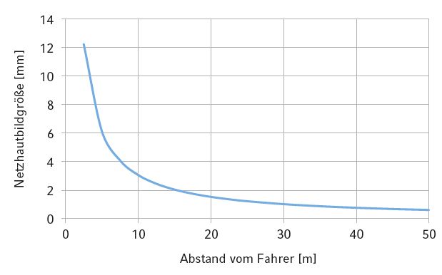 Die hohe Dichte im Straßenverkehr lässt kein unabhängiges Autofahren zu, viel- mehr bewegt sich der Verkehr häufig in Kolonnen vorwärts. Unter Kolonnenverkehr versteht man die Fortbewegung von mindestens drei dicht aufgeschlossenen Fahrzeugen in derselben Richtung bei nahezu gleicher Geschwindigkeit. Da die Abstände zwischen den einzelnen Fahr- zeugen einer Kolonne häufig gering sind, stellt diese Verkehrssituation große Anforderungen an die Verarbeitung von Bewegungsinformationen aus der Umwelt. Bei Entfernungen von weniger als 20 Metern führen geringfügige Variationen des Abstands zu deutlich veränderten Größen der Netzhautbilder (siehe Abb. 15). Eine starke Zunahme der Netzhautbildgröße liefert die Information, den Abstand zum vorausfahrenden Fahrzeug durch Reduzierung der eigenen Geschwindigkeit wieder zu vergrößern.