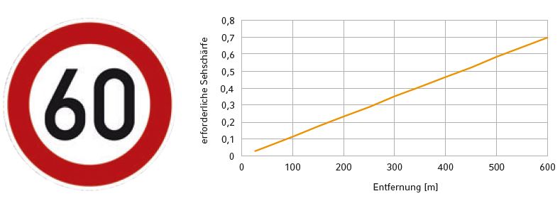 Das Erkennen eines Verkehrszeichens stellt nur moderate Anforderungen an die Sehschärfe. Verkehrszeichen gibt es in drei Größenklassen, die von der jeweiligen zulässigen Höchstgeschwindigkeit, die auf der Straße gefahren werden darf, abhängen. In geschlossenen Ortschaften so- wie auf Straßen außerhalb geschlossener Ortschaften stehen Verkehrszeichen der Größenklasse 2. Die runden Verkehrszeichen (Ronde) haben einen Durchmesser von 60 Zentimeter. Die Zeichen zur Angabe der erlaubten Höchstgeschwindigkeit sind 25 Zentimeter hoch und die Sehschärfe niedriger ist als in der Fovea. In einer Entfernung von 400 Metern wird die Geschwindigkeitsangabe auf dem Schild folglich nicht erkannt werden. Das Verkehrszeichen, das in dieser Entfernung aber in seiner Gesamtheit erkannt wird, stellt einen äußeren (exogenen) Reiz dar, der eine Sakkade auslöst, die zu einer zentralen Abbildung des Verkehrsschildes führt und damit das Erkennen der Geschwindigkeitsangabe ermöglicht. Diese exogene Orientierung erfolgt reflektorisch und automatisch aufgrund von Veränderungen im peripheren Gesichtsfeld.