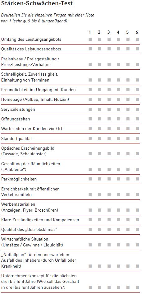 Fragen Sie sich zunächst, wo Sie selbst die individuellen Stärken und Schwächen Ihres Geschäfts sehen. Beantworten Sie dazu die Fragen im Stärken-Schwächen-Test am Ende dieses Beitrags. Jede Frage, in der Sie sich mit der Note 1 oder 2 bewerten, zeigt Ihre Stärken. Die Noten 5 und 6 zeigen Ihre derzeitigen Schwächen. Wenn sie alle Fragen beantwortet haben, dann kreuzen Sie aus Ihrer Sicht die drei wichtigsten Stärken und die drei gefährlichsten Schwächen an. So erkennen Sie, in welchen Bereichen der größte Handlungsbedarf besteht. Beziehen Sie bei Bedarf auch Ihre Mitarbeiter in die Beantwortung der Fragen ein, um mehrere Meinungen und Sichtweisen zu den einzelnen Punkten zu berücksichtigen.