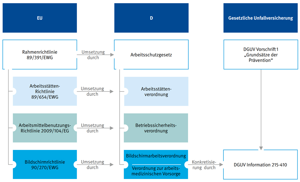 Die rechtliche Grundlage für die Arbeit am Bildschirm bildet die Rahmenrichtlinie 89/391/EWG, welche die Mindestanforderungen an den Arbeitsschutz für alle Mitgliedsstaaten der EU festlegt (siehe Abb. 2).