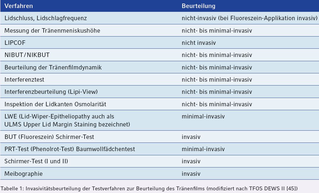 Die quantitative und qualitative Beurteilung des Tränenfilms ist neben der subjektiven Evaluierung der Beschwerden der wichtigste Bestandteil zur Diagnose des Trockenen Auges. Die Tränenfilmbeurteilung kann mit neuen technischen Geräten wie zum Beispiel einem Osmometer oder auch multifunktionellen Topographiesystemen erweitert werden. Unabhängig vom verwendeten Untersuchungsinstrument sollte die Testreihenfolge von nicht- beziehungsweise wenig-invasiven Testverfahren hin zu invasiven aufgebaut werden. [45]