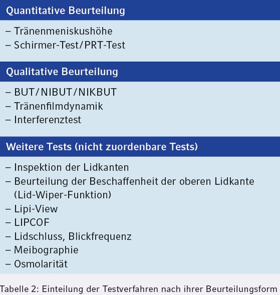 Quantitative Tests liefern Aussagen über die produzierte Tränenmenge in einer bestimmten Zeit sowie über das im Bereich der geöffneten Lidspalte befindliche Tränenvolumen. Die Menge des Tränenfilms ist abhängig von der Produktion, der Verteilung und dem Abfluss der Tränenflüssigkeit. Qualitative Testverfahren liefern Aussagen über die Stabilität und die Zusammensetzung des Tränenfilms. Die Tests geben zum Teil Aufschluss über die Eigenschaften der einzelnen Phasen