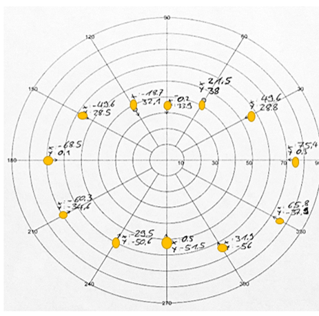 Die Messungen der Reaktionszeiten wurden, sofern erforderlich, mit Vollkorrektion sowie einer zusätzlichen Nebelung (Defokus) von -1 dpt mit dem Peristat Perimeter (Rodenstock Instrumente, Ottobrunn) durchgeführt. Es wurde ein spezielles Prüfpunktraste mit insgesamt 20 Prüfpunkten programmiert. (Abb.1).