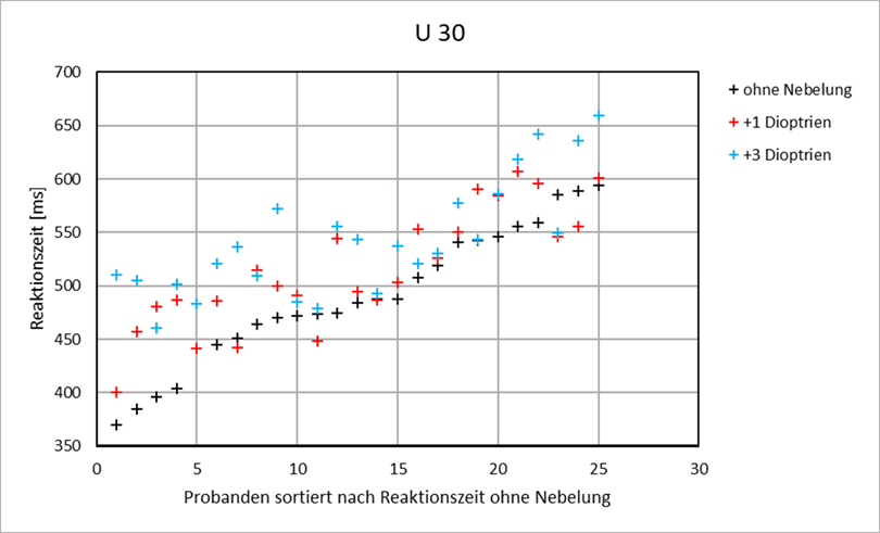 Bereits eine Nebelung um eine Dioptrie ruft eine signifikante Verlängerung der Reaktionszeit in beiden Altersgruppen (U30 und Ü50) hervor. In der Altersgruppe U30 wurde ohne Defokus eine mittlere Reaktionszeit von 490 ms bei einer Standardabweichung von 71 ms ermittelt. Bei einer Nebelung mit einer Dioptrie steigt die Reaktionszeit auf 515 ms bei einer Standardabweichung von 63 ms an. Der Unterschied ist statistisch signifikant (p = 0.0073). In Einzelfällen waren Verzögerungen der Reaktionszeit um mehr als 20 Prozent zu beobachten. Ein Defokus von drei Dioptrien bewirkt einen Anstieg der Reaktionszeit um mehr als 50 ms auf 542 ms bei einer Standardabweichung von 64 ms. Der Unterschied zur Ausgangssituation ist statistisch signifikant (p <0,001).