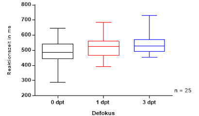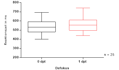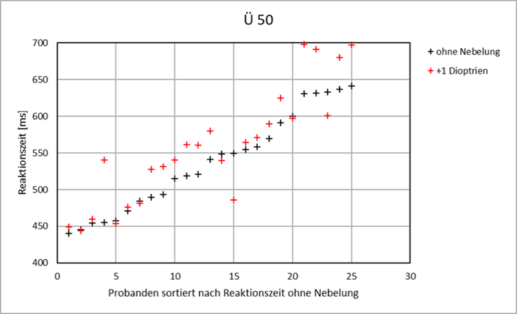 In der Altersgruppe Ü50 wurde eine mittlere Reaktionszeit ohne Defokus mit 537 ms (Standardabweichung ±75 ms) bestimmt. Eine Nebelung mit einer Dioptrie führt zu einem geringfügigen Anstieg der Reaktionszeit auf 558 ms (Standardabweichung 83 ms).