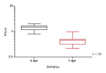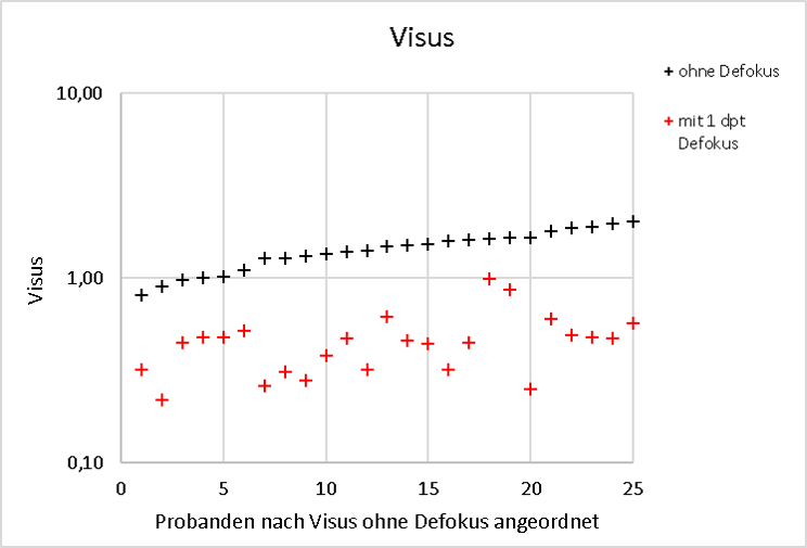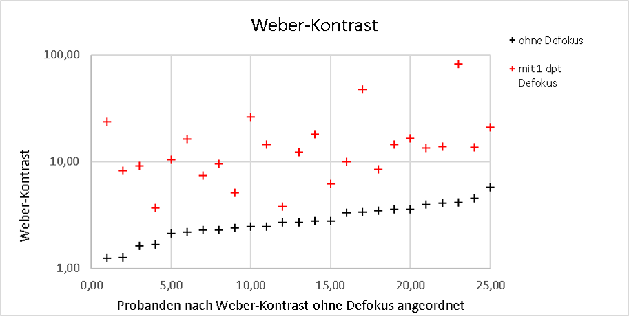 Mit dem Freiburger Visustest wurde ein Schwellenkontrast von 2,91 (Standardabweichung 1,1) bestimmt. Eine Nebelung von 1 dpt führt zu einem Anstieg des Schwellenkontrasts auf einen mittleren Wert von 16,6. Die hohe Standardabweichung von 16,3 weist auf mehrere Ausreißer hin. Der Unterschied der beiden Schwellenkontraste ist statistisch signifikant (p<0,0001; Wilcoxon-Rang-Test). Eine Nebelung von 1 dpt macht einen mehr als fünfmal höherer Kontrast erforderlich, um Sehzeichen zu erkennen. Auffällig ist auch die sehr breite Streuung der Messergebnisse des Schwellenkontrastes bei Nebelung.