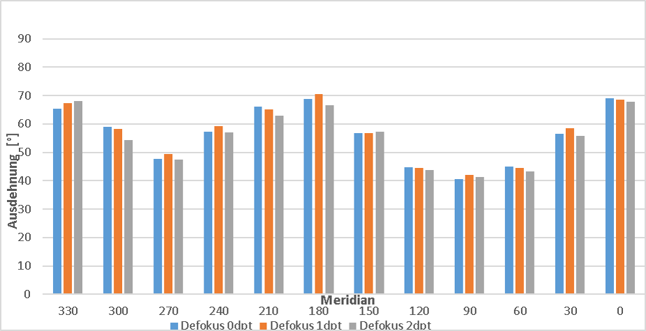 Die Ausdehnung des Gesichtsfeldes wird durch eine Neblung nicht beeinflusst. Vertikal beträgt die Ausdehnung des Gesichtsfeldes nach oben etwa 40° und nach unten etwa 48°. Die horizontale Ausdehnung des Gesichtsfeldes liegt zwischen 65° und 70° sowohl in nasaler als auch in temporaler Richtung. Die Unterschiede zwischen Emmetropie und Nebelungen um 1 dpt oder 2 dpt machen nur 1° bis 2° aus. Die Unterschiede sind statistisch nicht signifikant (p>0,8; einseitiger T-Test).