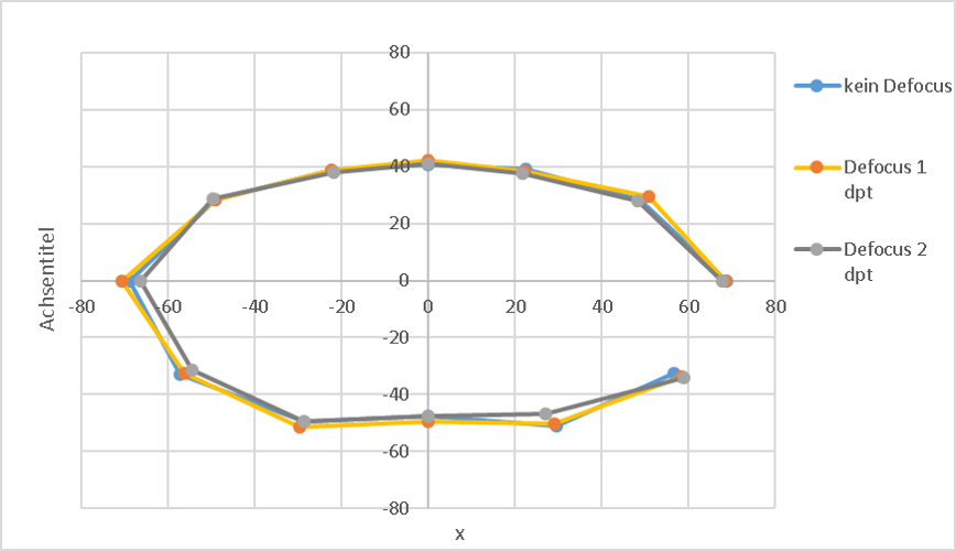 Wie auch in der kinetischen Perimetrie, wurden zur Nebelung der Probanden Kontaktlinsen (Dailies AquaComfort PLUS®, Alcon Pharma GmbH; Freiburg i. Brsg.) verwendet. Für jeden Studienteilnehmer waren zwei Messdurchläufe nötig, einmal ohne Defokus und einmal mit einem Defokus -1 dpt. Die Kontaktlinsen hatten eine Wirkung von +4,25 Dioptrien, um den gewünschten Defokus zu erreichen. Mit welchem Refraktionszustand begonnen wurde, wurde zufällig entschieden. Zwischen den beiden Messungen lag eine angemessene Erholungszeit von mindestens zehn Minuten, um einen möglichst geringen Abfall der Konzentrationsfähigkeit und der Motivation der Probanden aufkommen zu lassen. Während der circa 20-minütigen Untersuchung wurden die Probanden immer wieder durch die Untersucher motiviert, um die Aufmerksamkeit aufrecht zu halten.