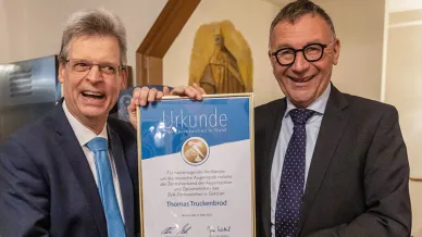 Thomas Truckenbrod wurde am zweiten März-Wochenende auf der Mitgliederversammlung des Zentralverbands der Augenoptiker und Optometristen (ZVA) in Weimar verabschiedet. Er ist mit 13 Jahren und sechs Monaten nicht nur der ZVA-Präsident, der am längsten amtiert hat. Vielmehr hat er in dieser Zeit die Branche geprägt. Deshalb wurde Truckenbrod nun als Ehrenpräsident des Verbands verabschiedet und erhielt das Goldene Ehrenzeichen.
