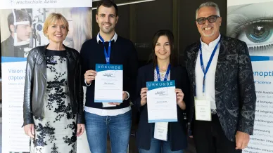 Über den 15. Karl Amon Optometry Award freuen sich Jessica Gruhl und Maximilian Aricochi. Die beiden Jahrgangsbesten des berufsbegleitenden Master-Studiengangs Vision Science and Business (Optometry) an der Hochschule Aalen, erhielten die Auszeichnung für herausragende wissenschaftliche Arbeiten mit hohem praktischem Nutzen für die Augenoptik-Branche.
