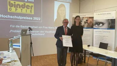 Ein optometrisches Visualtraining kommt dann zum Einsatz, wenn Sehstörungen den Alltag beeinträchtigen und die Augen nicht mit klassischen Methoden wie einer Brille versorgt werden können. Das in Deutschland eher unbekannte Training hat nun eine Augenoptik/Optometrie-Studentin in ihrer Bachelorarbeit untersucht. Durch die Hürden der Pandemie war das Verfassen der Bachelorarbeit eine wirkliche Herausforderung. Dafür wurde sie jetzt mit dem Hochschulpreis der Binder Optik GmbH geehrt.