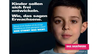 Die aktuelle bundesweite Imagekampagne des Handwerks will angesichts des Fachkräftebedarfs zu gesellschaftlichem Umdenken aufrufen. Seit wenigen Tagen ist die Kampagne für mehrere Wochen in TV-Spots sowie auf Motiven im Internet und deutschlandweit auf Großplakaten zu sehen.