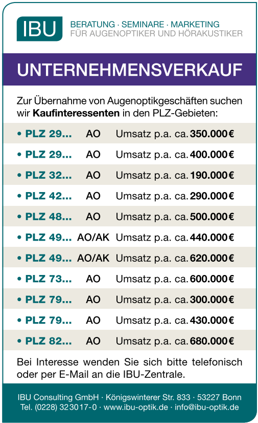 Zur Übernahme von Augenoptikgeschäften suchen wir Kaufinteressenten in den PLZ-Gebieten: