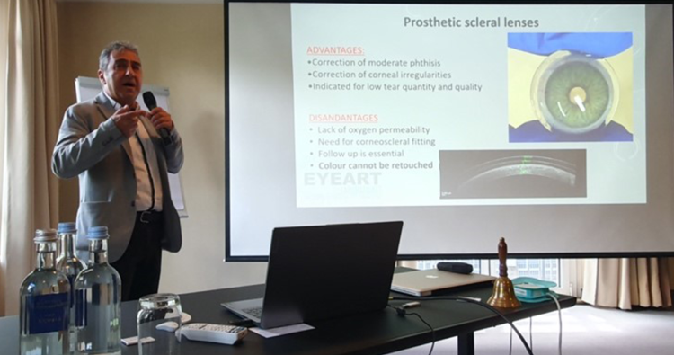 Lefteris Karageorgiadis von EyeArt aus Thessaloniki/Griechenland ging in seinem Vortrag auf die Auswahlmöglichkeiten prothetischer Kontaktlinsen ein.