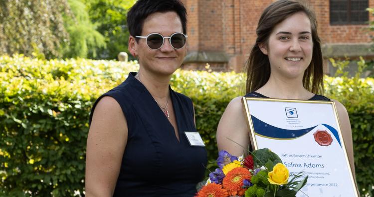 Ehrenurkunde für Selina Adoms: Gesellenprüfungsausschussvorsitzende Friederike Brenzek (links) freut sich mit der Jahrgangsbesten über deren sehr guten Prüfungsergebnisse.