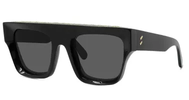 Das rechteckige Oversize-Modell SC40006I (01A) aus schwarzem Bio-Acetat schafft eine selbstsichere und markante Silhouette. Das Stella McCartney-Logo ist am oberen Rand der Brille auf den Metallstiften zu finden. Die Bügel sind mit zwei goldenen Dots, der Signatur der Maison, und dem Logo geschmückt.