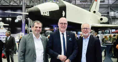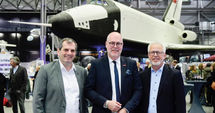 In der Raumfahrthalle des Technikmuseums in Speyer begrüßte der Südwestdeutscher Augenoptiker- und Optometristen-Verband seine Gäste. SWAV-Geschäftsführer Peter Kupczyk, Peter Haas, Hauptgeschäftsführer von Handwerk BW, und SWAV-Vorsitzender Matthias Müller postierten sich für das Foto vor dem Space-Shuttle Buran.