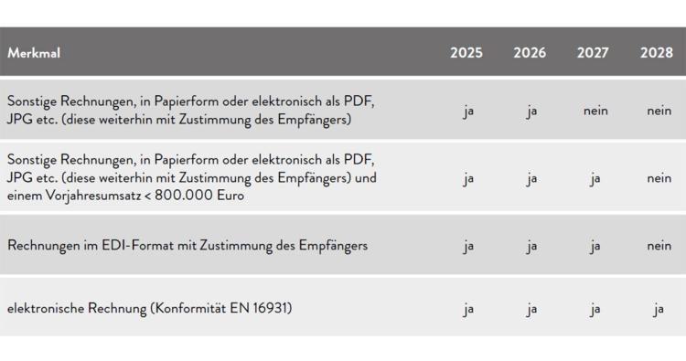 Empfang, Verarbeitung und revisionssichere Archivierung einer elektronischen Rechnung im B2B sind ab sofort (Stichtag war der 1. Januar 2025) in Augenoptikfachgeschäften zu ermöglichen. Dies gilt, ohne vorher die Zustimmung des Rechnungsempfängers, das heißt des Augenoptikfachgeschäfts als einkaufendes Unternehmen, eingeholt zu haben. Der zeitliche Engpass bei der Umsetzung der Neuerung liegt somit auf der Seite des Rechnungsempfangs im Unternehmen. Ebenso gilt ab sofort die Pflicht zur Ausstellung einer elektronischen Rechnung. Da der Aufwand zur Umsetzung hoch ist, hat der Gesetzgeber jedoch Übergangsregelungen für die Jahre 2025 bis 2027 für die Rechnungsaussteller vorgesehen (siehe Tabelle 1).