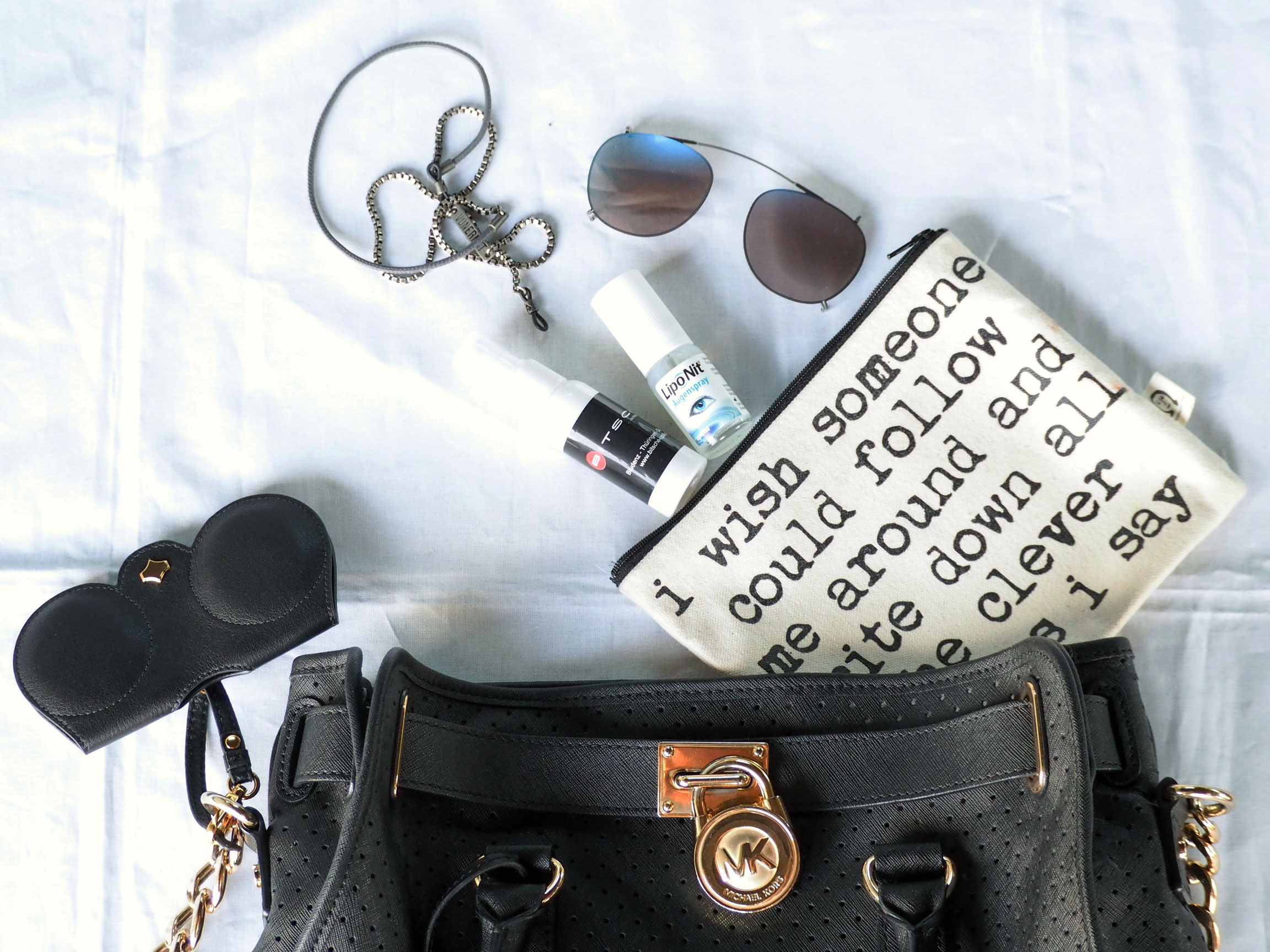Damit ich alle meine Accessoires immer gut zur Hand habe, packe ich Sie in ein kleines Beautycase und ab in die Handtasche damit. Somit kann ich vermeiden, dass die Sonnenbrille und die Accessoires im Urlaub mit Sand in Verbindung kommen und muss mir keine Sorgen bezüglich Kratzern auf dem Glas machen. Mit einem Griff habe ich die Sonnenbrille plus Accessoires zur Hand. Die Tasche in der Tasche macht es möglich.