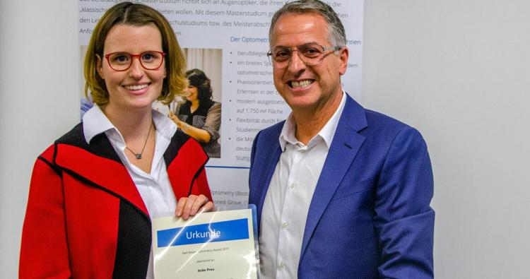 Für ihre Abschlussarbeiten haben die Alumni des berufsbegleitenden Masters "Vision Science and Business (Optometry)", Anke Preu und Marc Fankhauser, den Karl Amon Optometry Award erhalten. Der mit 2.000 Euro dotierte Preis wurde in diesem Jahr zum zehnten Mal vergeben. Beide Abschlussarbeiten beschäftigten sich mit dem fortgeschrittenen Alter und lieferten nach Meinung der Jury "nützliche Forschungsergebnisse für eine älter werdende Gesellschaft". Die Absolventen erhielten die Auszeichnung "für ihre wissenschaftlichen Arbeiten mit hohem praktischem Nutzen für die Branche", begründete die Jury ihre Entscheidung.