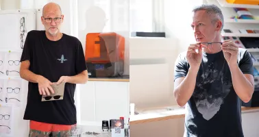 Links: Produktmanager Jeff Hesh Riese erläutert die unterschiedlichen Produktionsprozesse der Metallbrillen. Rechts: Frederic Lassalle erklärt die Schritte bei der Produktion von Acetatbrillen und der 3D-Kollektion „Quantum“. Prototypen für Neuheiten produziere man hausintern, das spare viel Zeit, sagt Lassalle.