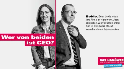 Die Kampagnenmotive, die im Laufe des Jahres in überregionalen Tageszeitungen, Nachrichtenmagazinen und zwei kurzen Werbespots online und im Fernsehen zu sehen sind, stellen jeweils zwei Protagonisten und Protagonistinnen zu einem Thema gegenüber – und spielen dabei mit vermeintlichen Vorurteilen. Wer von beiden mehr mit dem Kopf arbeitet, ein Unternehmen führt, weltweit unterwegs oder kreativer ist, werden die Betrachterinnen und Betrachter gefragt. Und die Antwort lautet stets: beide. Denn alle sind Handwerkerinnen und Handwerker. Oberlander findet ihr Kampagnenmotiv, auf dem sie in Jeansjacke neben einem Mann in Anzug und Krawatte zu sehen ist, gepaart mit der Frage „Wer ist CEO?“ gelungen. Auch die Resonanz der Mitarbeiterinnen, Kollegen und Bekannten sei bis jetzt durchweg positiv. „Auf die Wahl des Motivs und des Themas hatte ich keinen Einfluss“, sagt Oberlander. Die Augenoptikermeisterin und Betriebswirtin ist aber dennoch zufrieden, für das Thema Unternehmensführung ausgewählt worden zu sein. Anfang 2020, kurz vor Beginn der Corona-Pandemie, startete sie ihr eigenes Geschäft im schwäbischen Offingen. Mit Erfolg. Heute weiß sie, die Freiheiten und Möglichkeiten als Handwerkerin und CEO der eigenen Firma zu schätzen.