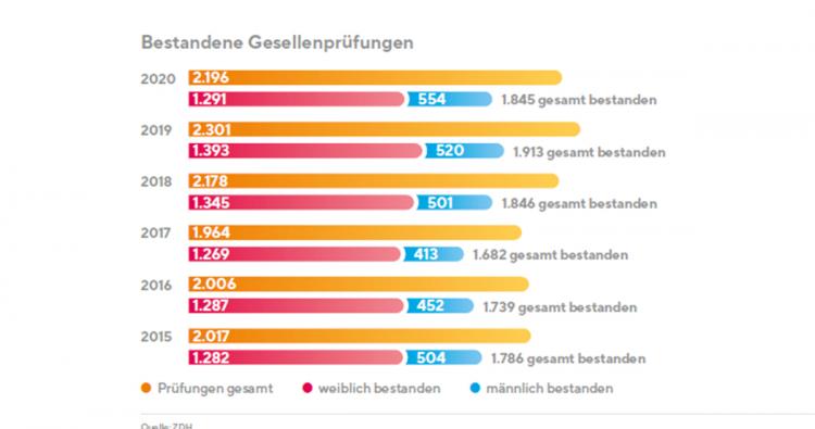Die guten Nachrichten vorweg: Im Durchschnitt aller Berufe liegt die Ausbildungsquote in Deutschland bei nur 4,8 Prozent. Die Augenoptik weist hier mit einer Quote von 20,4 Prozent im Vergleich einen außerordentlich hohen Wert auf. Und auch die Zahl der erfolgreich absolvierten Ausbildungen bleibt erfreulich hoch. Trotz Corona und den damit einhergehenden Beschränkungen gab es 2020 2.196 bestandene Gesellenprüfungen – und damit nur unwesentlich weniger als im Jahr zuvor (siehe Grafik 1).