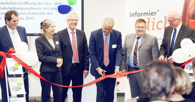 Das Durchschneiden des roten Bandes am Tag der Feierlichen Eröffnung 2015: (v.l.) Geschäftsführer Peter Kupczyk, Stadträtin Renate Rastätter, Vorsitzender Matthias Müller, Ministerialdirektor Guido Rebstock, ehem. Vorsitzender Dieter Mattern und Ehrenvorsitzender Dieter Mollenkopf,