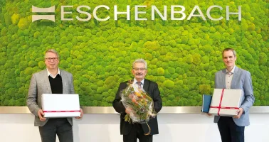 Ehrenvolle Verabschiedung im Hause Eschenbach: Als Repräsentanten der Divison Optik ehren Matthias Daum, Vertriebsdirektor (l.), und Markus Anacker, Executive Vice President, Bernd Papsdorf (M.).